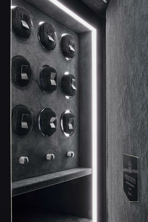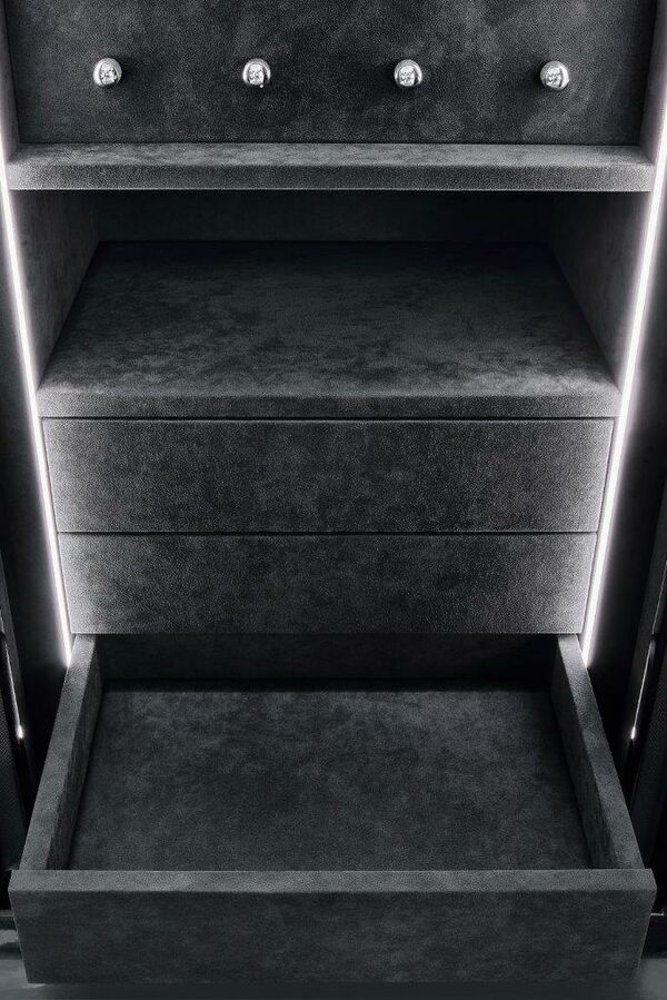 | Wyposażenie | - u góry 12 rotomatów, - pod nimi przestrzeń otwarta z półką, - poniżej 3 szuflady na biżuterię bez uchwytów, - oświetlenie wnętrza LED białe, zainstalowane na krawędziach wnętrza, - rygle, elementy zawiasów, okucia zamka i klamka w kolorze srebrnym z połyskiem. |