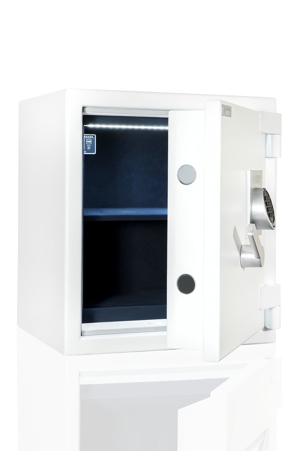 | Wyposażenie | - półka przestawna w trzech poziomach, - wnętrze wyściełane granatową alcantarą Navi, - przeszycia białą nicią w środku sejfu i na płycie osłonowej, - oświetlenie wnętrza LED. |