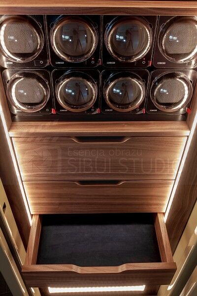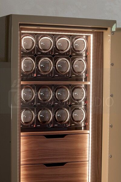 | Wyposażenie | – wnętrze wykonane z drewna orzecha amerykańskiego polakierowanego satynowo, – 16 rotomatów – 4 szuflady wyłozone granatową alcantarą 7941 NavyBlue, – oświetlenie wnętrza LED. |