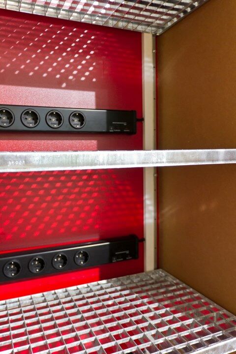 Ognioodporna szafa do przechowywania i ładowania baterii litowych - 4 listwy po 10 gniazd ładowania, wyposażona w system wentylacyjny, nadstawkę kontrolną dla systemu ładowania oraz system gaszenia pożaru. Badana na działanie ognia zarówno od wewnątrz jak i z zewnątrz.