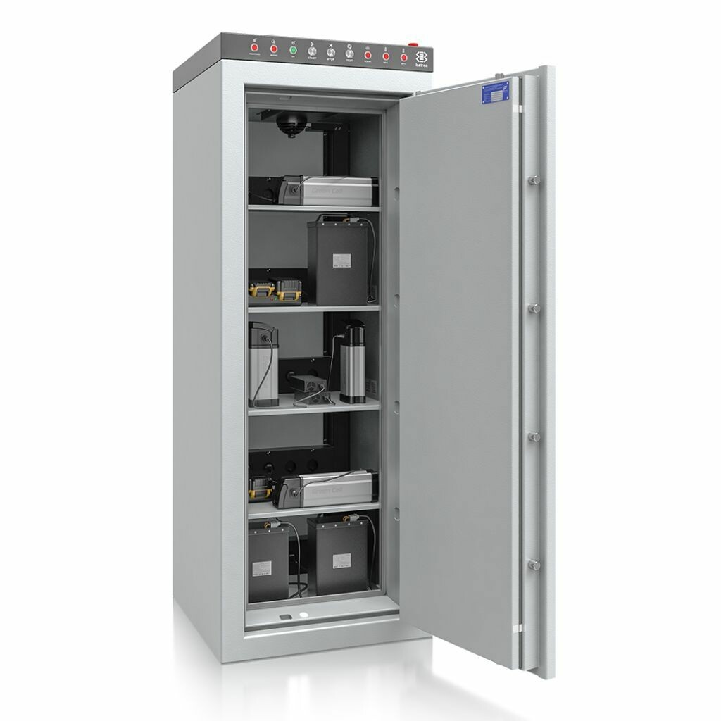 | Wyposażenie | - 25 gniazd ładowania typu E (Polska, Francja, Belgia, Czechy, Słowacja), - 2 otwory przelotowe w dnie (opcjonalne mocowanie do podłoża, - przyłącze wentylacji o wysok. min. 50 mm i średnicy DN100, - system wentylacyjny: automatyczne zamknięcie klapy w razie zagrożenia, wskaźnik położenia klapy, minimalny przepływ 30 m³/h, - system uszczelnień: przeciwpożarowe, przeciwdymne i przeciwogniowe, - panel sterujący: sygnalizacja LED – wizualna sygnalizacja stanu, przyciski piezoelektryczne – sterowanie funkcjami, przycisk awaryjny STOP/EMERGENCY, sygnalizator dźwiękowy, zestaw bezpieczników. Pozostałe dane: - pojemność i moc maks. pojemność przechowywanych akumulatorów/baterii na poziomie: 3000 Wh, maks. pojemność przechowywanych akumulatorów/baterii w szafie: 3000 Wh, maks. moc ładowania na poziomie: 3000 W, maks. moc ładowania w szafie: 3000 W |
